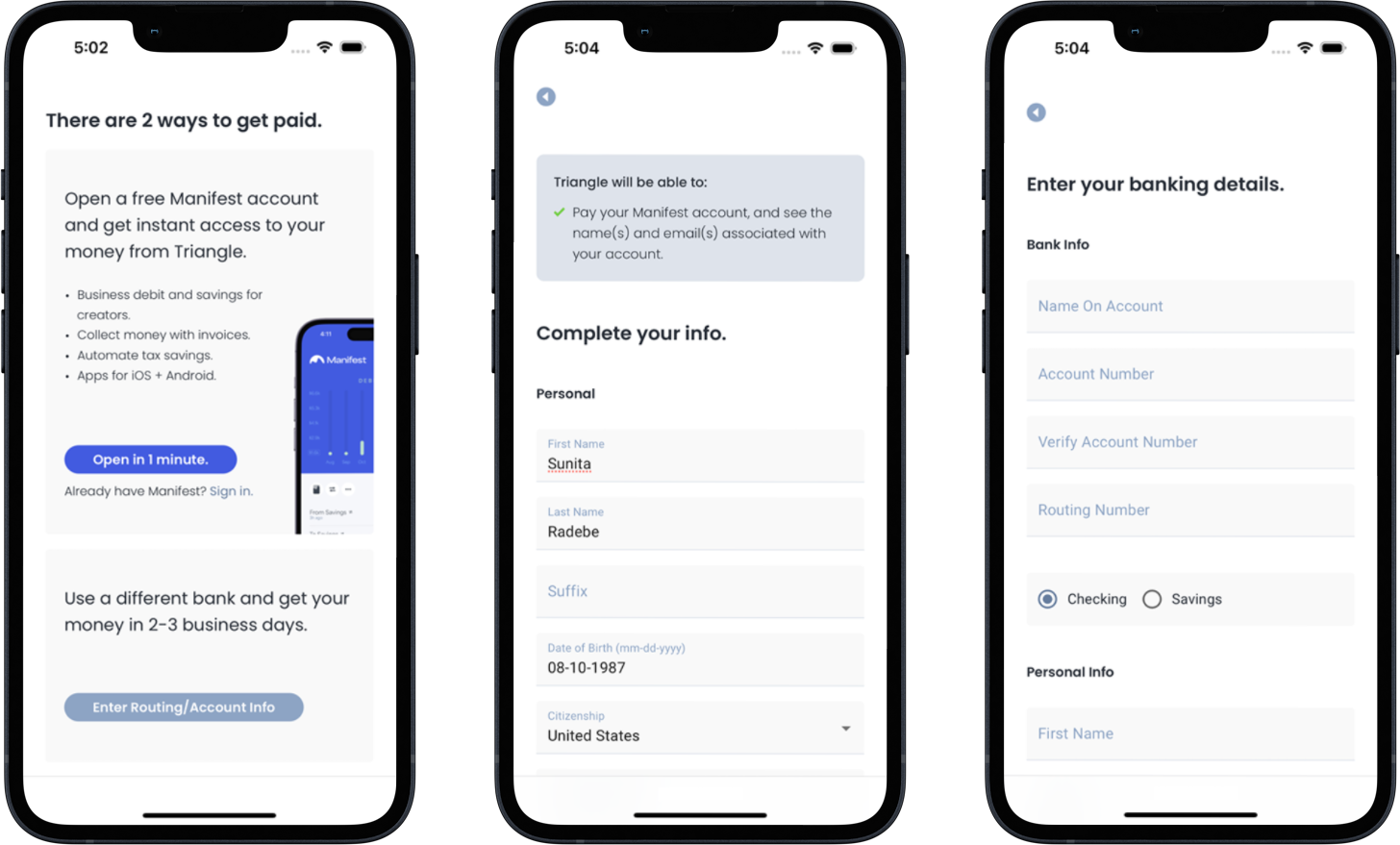 No problem! We’ll help your US-based creators open a business account inside Connect in under a minute — no paperwork required. Manifeset takes care of things so you don’t have to:Manifest handles: